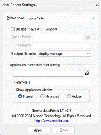 Neevia docuPrinter LT is a PDF printer driver which means that in order to convert a file to PDF you must print to docuPrinter from your application, just as you would with any other printer. Most applications have a Print dialog box command available in the File menu. To use docuPrinter LT: