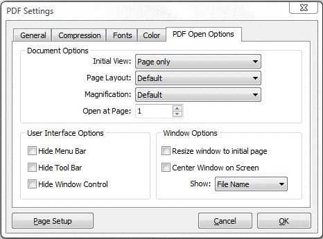 The PDF Open Options are organized into three areas: Document Options, Window Options, and User Interface Options. The Document Options control the appearance of the document within the document window, such as the magnification level and how it scrolls. The Window Options apply to the document window itself in relationship to the screen area of the user's monitor. The User Interface Options determine which controls appear when the user opens the document.