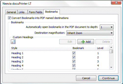 In the Bookmark column, deselect bookmarks for headings (or other items) that you don't want to be converted. You can change the level of the bookmark associated with a heading (or other item) only if that heading (or item) is selected. If a file contains paragraphs formatted using discontinuous heading levels, docuPrinter inserts blank bookmarks for each of the missing levels.