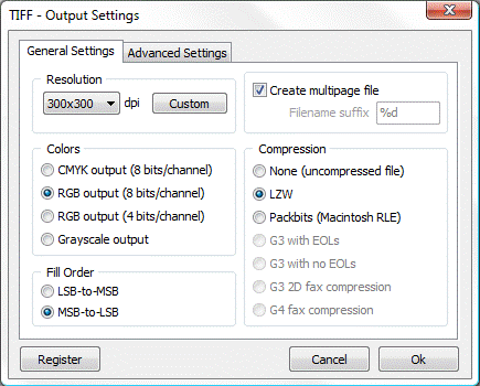 this feature allows you create a PDF document using an image acquired via a scanning device. In the Input section you will have to select the installed scanner, Sides, Color Mode and Resolution. You need to take into account the higher the scanning resolution the larger your PDF file will be. In the Output section you have the following options: