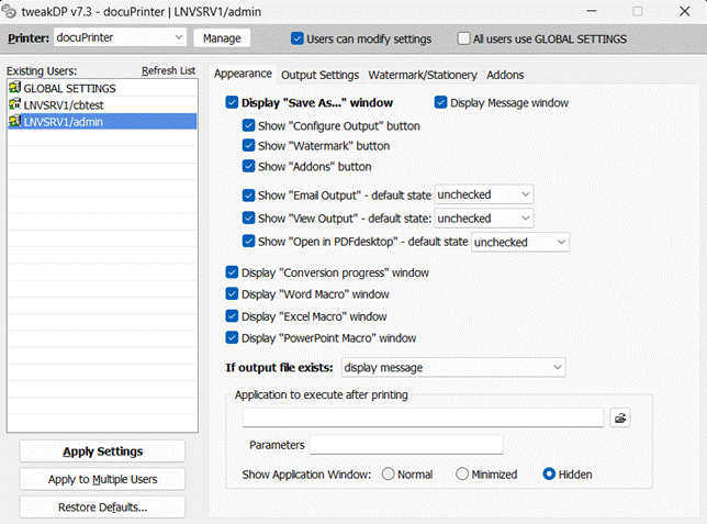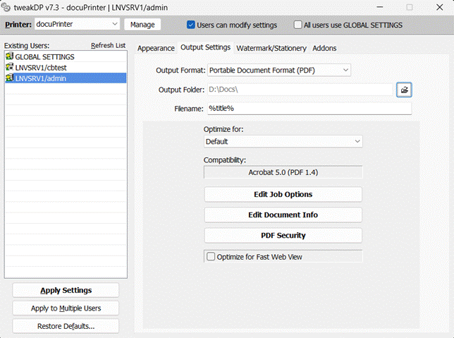 Configure docuPrinter TSE from the administrative console (tweakDP)