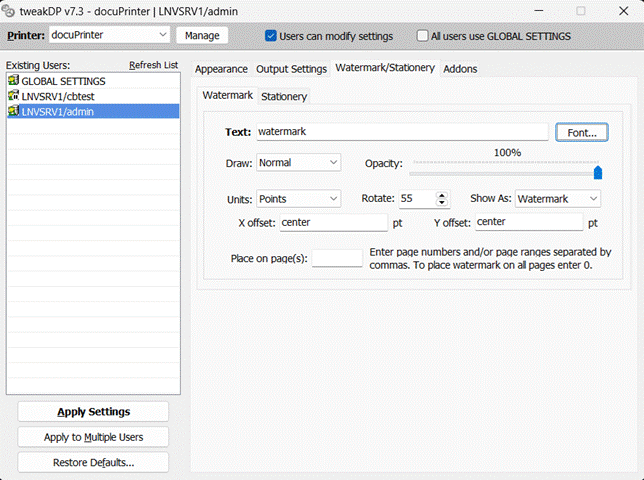 Position - specifies the measurement Units (Points, Inches, Centimeters or Millimeters), Rotation angle, Stamp placement (as stamp: over the page content or watermark: under the page content) and the X, Y coordinates. For the X coordinate you can use as values, instead of numbers center, left and right - as the name suggests they will position the watermark in the center of the page, on the left or right. For Y you have center, top and bottom which will place the watermark in the center of the page on top or in the bottom. To position your watermark on the right lower corner use X=right and Y=bottom.