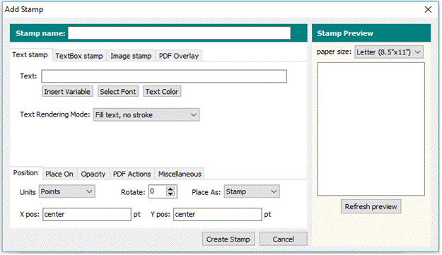 In order to see the stamp position, click the Refresh Preview button on the right-hand side. This is also valid when you edit an existing stamp which can be done by clicking Edit stamp in the Stamps window.